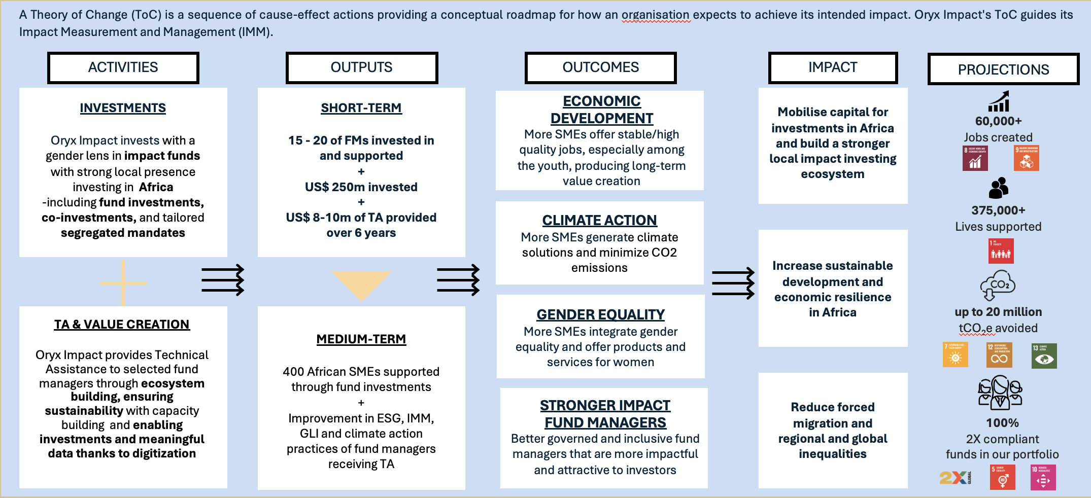 Oryx Impact complies with the recognized standards on impact measurement and integrates impact into each step of its investment process. Oryx Impact metrics are based primarily on IRIS and 2X Challenge indicators, a set of standardized metrics that are used to measure and describe the social (including gender), environmental, and financial performance of organizations and businesses receiving impact investment capital, and are aligned with the UN SDGs.